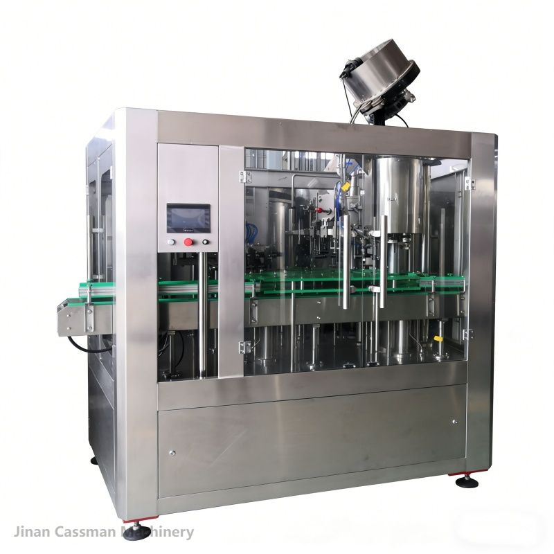 Cuando las botellas llegan a través del transportador de cadena a la máquina taponadora de botellas, el sensor de inducción electromagnética induce la botella, indicará al cargador de tapas que caiga la tapa a la botella, a través de la leva y la rueda de sellado, el cabezal de sellado caerá para presionar la tapa de la botella, una lata estará terminada y saldrá a través del transportador de cadena.